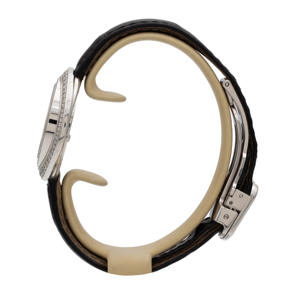 Boîtier "elliptique" en or gris serti de diamants, sur bracelet en cuir et boucle déployante en or gris signée.