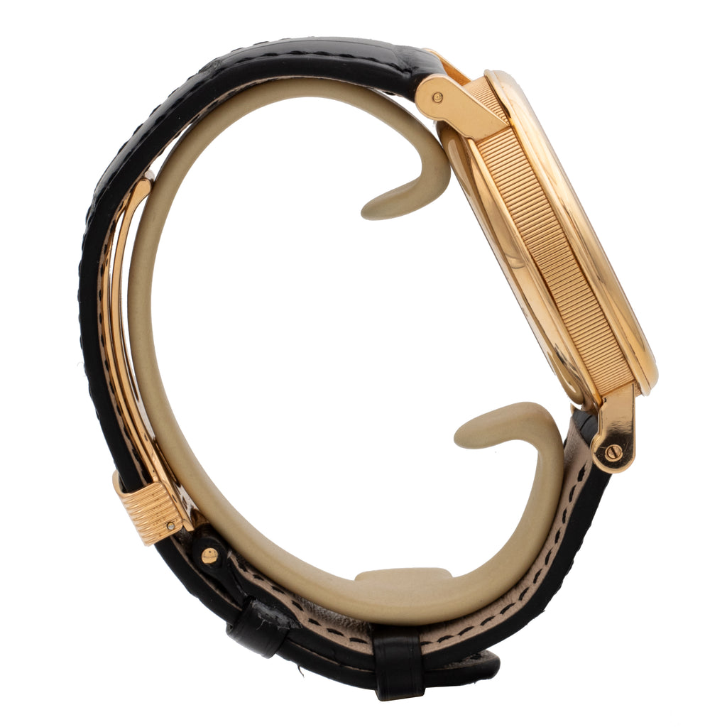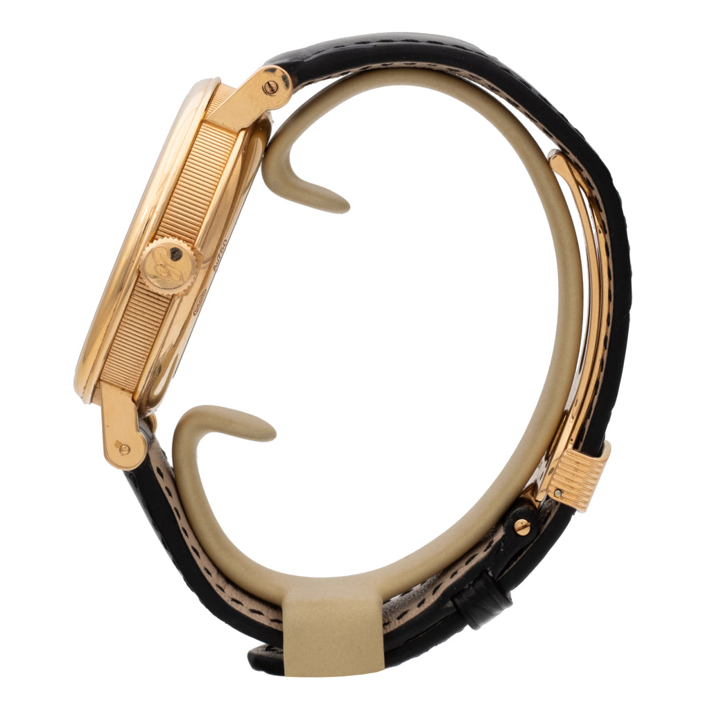 Boîtier en or rose, sur bracelet cuir et boucle déployante en or rose signée.