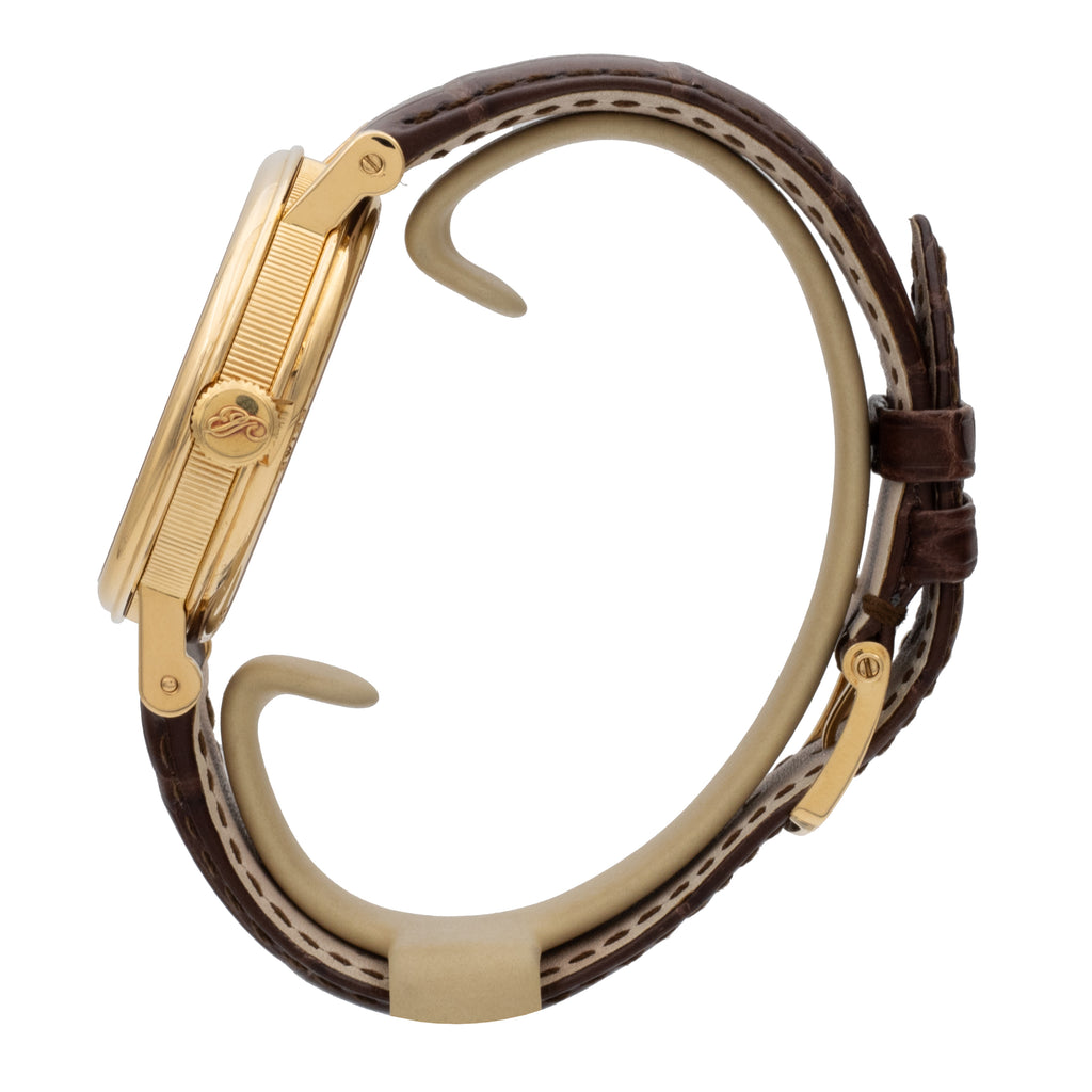Boitier en or jaune sur bracelet cuir avec boucle ardillon en or jaune signée.