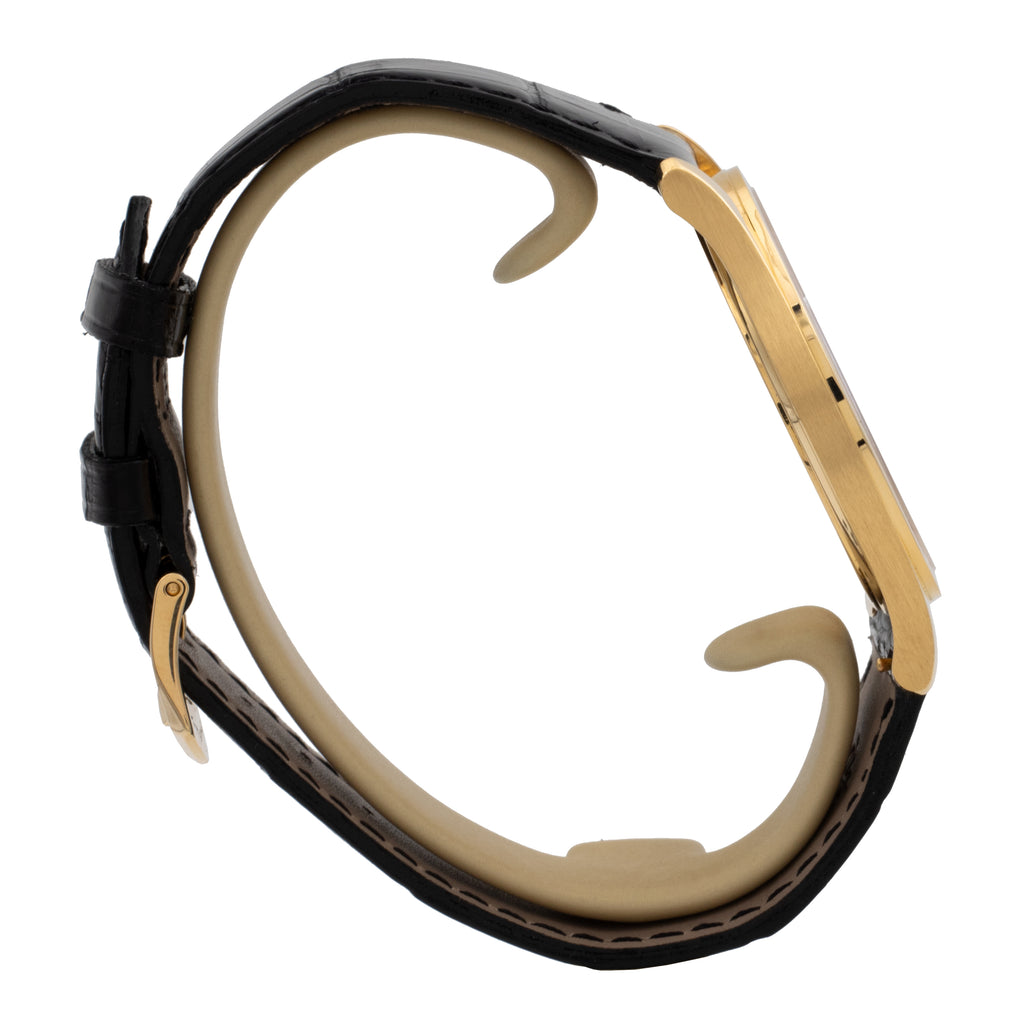 Boîtier en or jaune, sur bracelet cuir et boucle ardillon signée en or jaune.