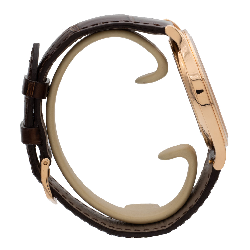 Boîtier en or rose, sur bracelet cuir et boucle ardillon en or rose signée.