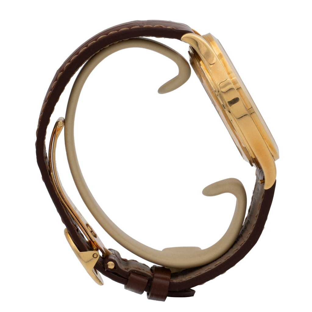 Boîtier en or jaune, sur bracelet en cuir et boucle déployante en or jaune signée.