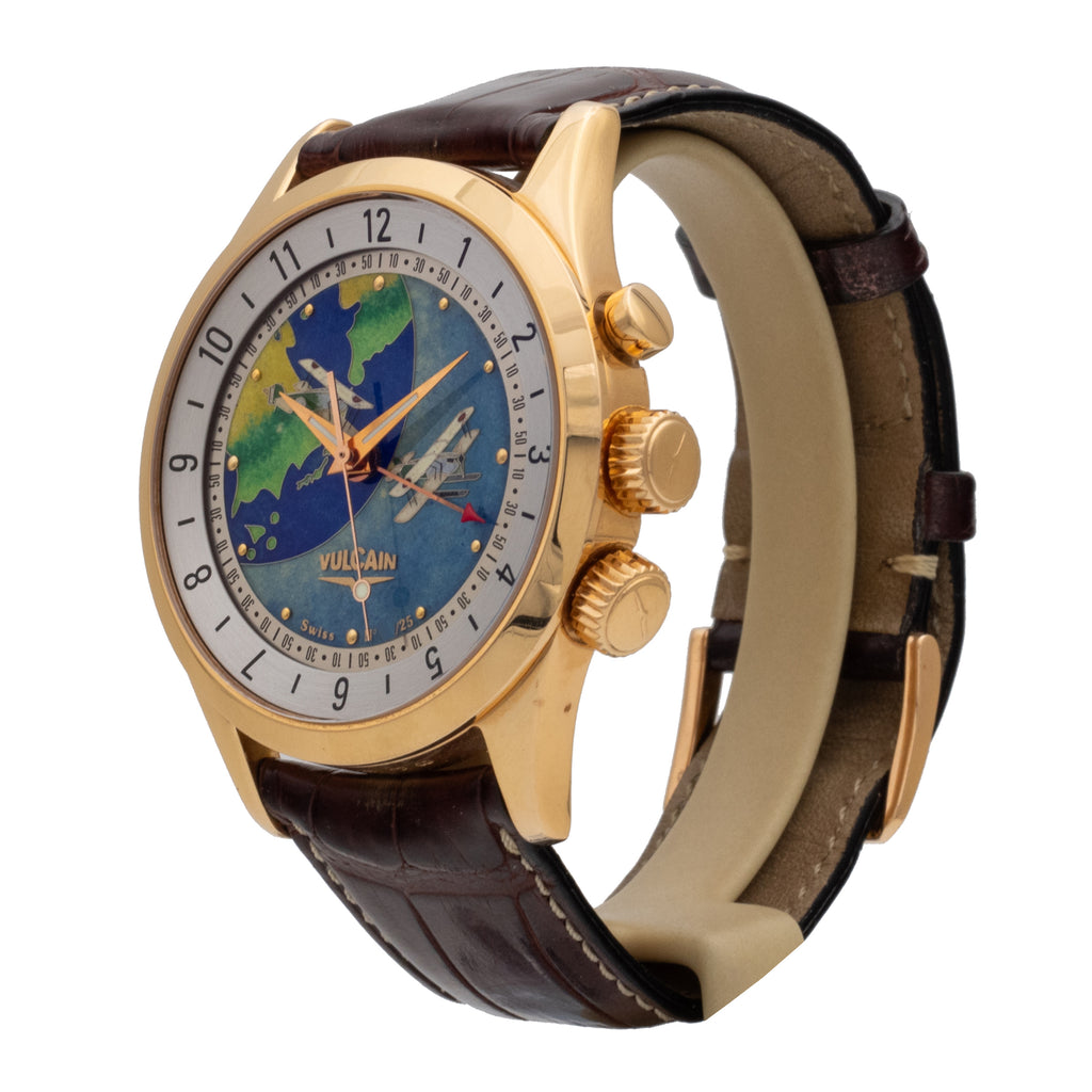 Montre Vulcain Cricket Dual Time référence 100506.033, produite dans une rare série limitée de 25 pièces équipées d'un cadran en émail cloisonné.