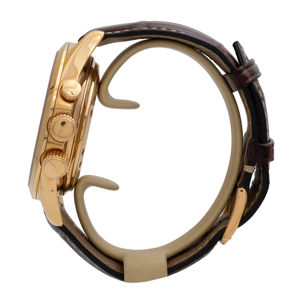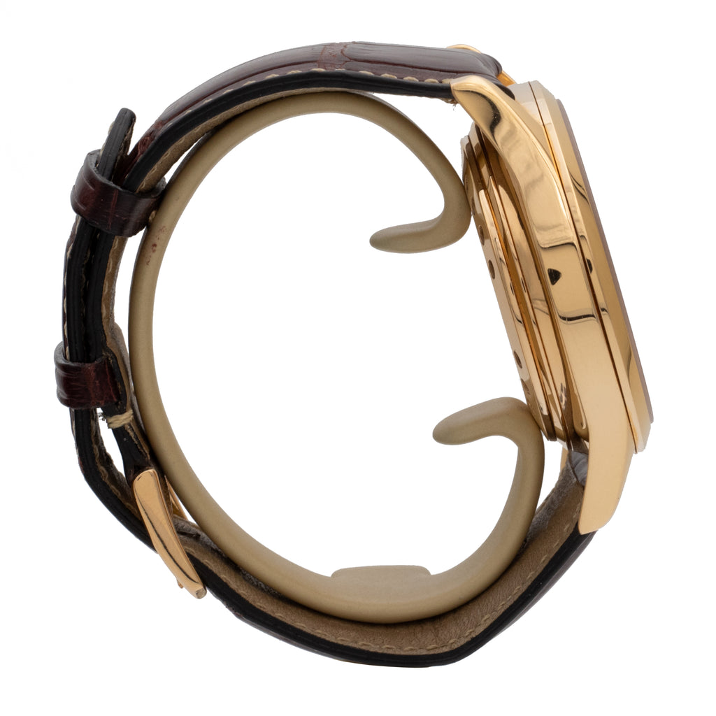Boîtier en or rose, sur bracelet cuir et boucle ardillon en or rose signée.