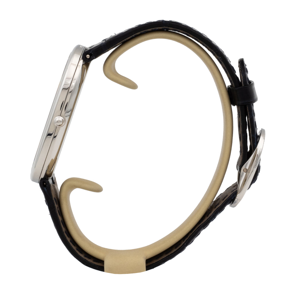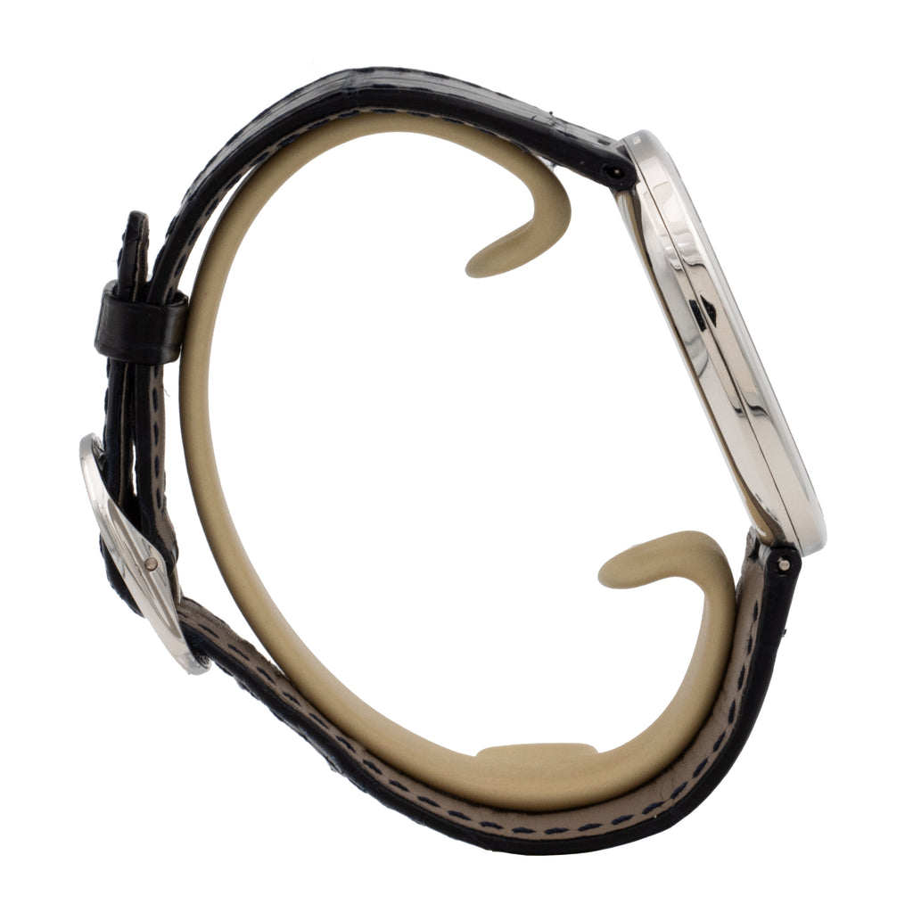 Boîtier en platine, sur bracelet en cuir et boucle ardillon en platine signée.