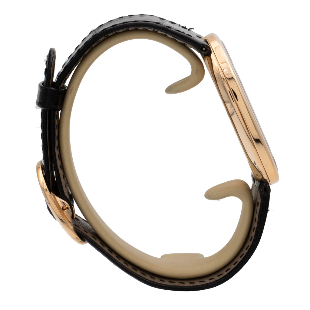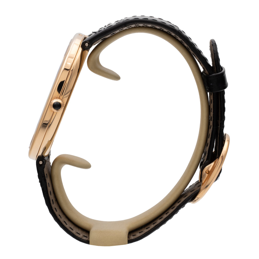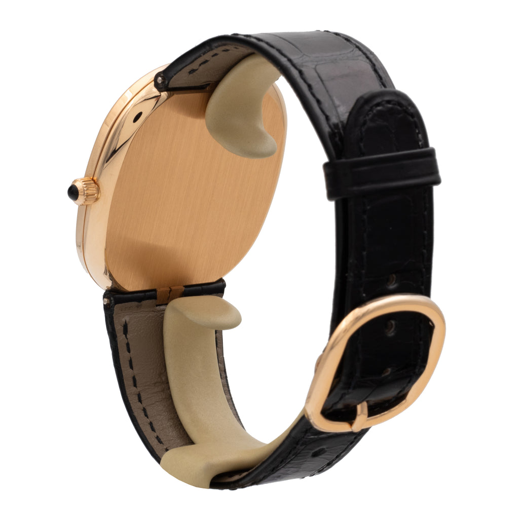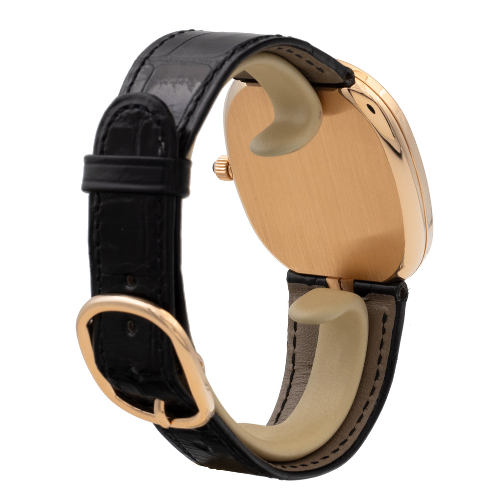 Boîtier en or rose, sur bracelet en cuir et boucle ardillon en or rose signée.