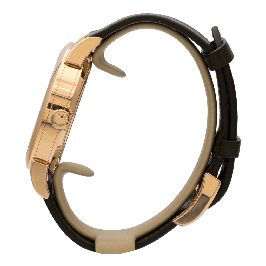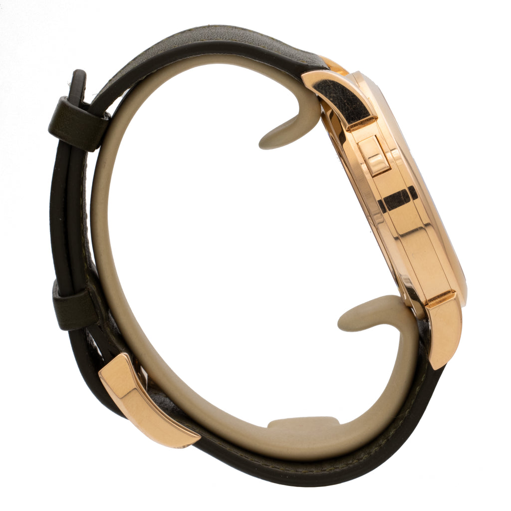 Boîtier en or rose, sur bracelet cuir et boucle ardillon en or rose.