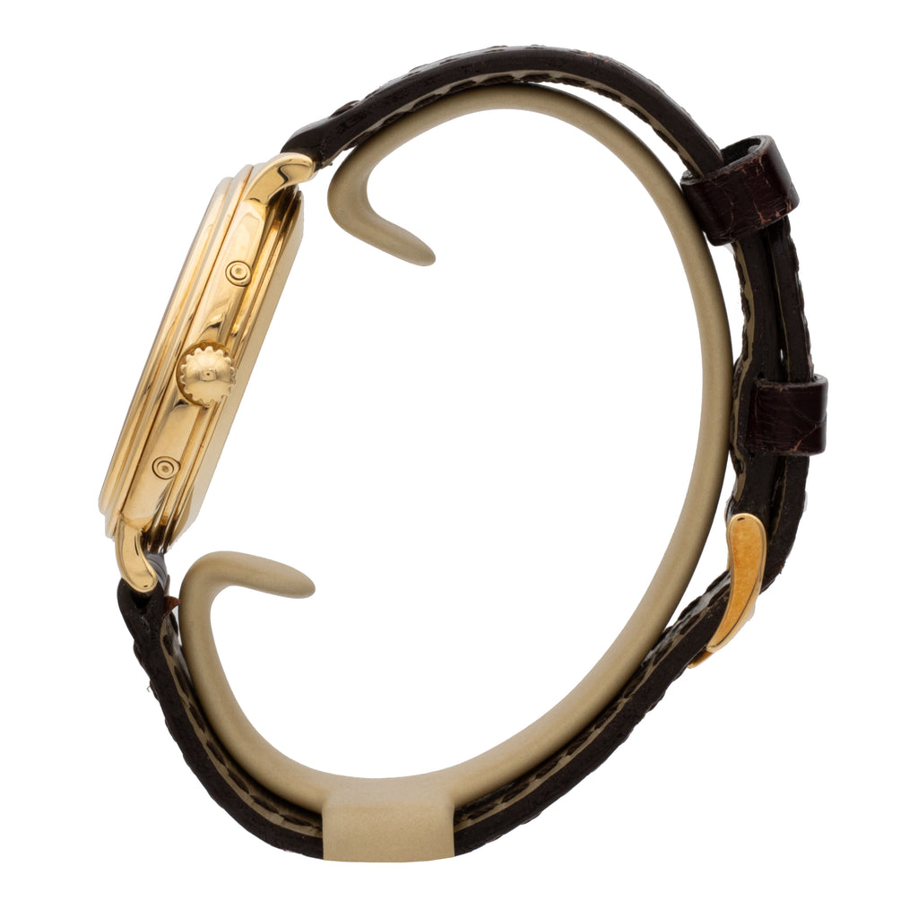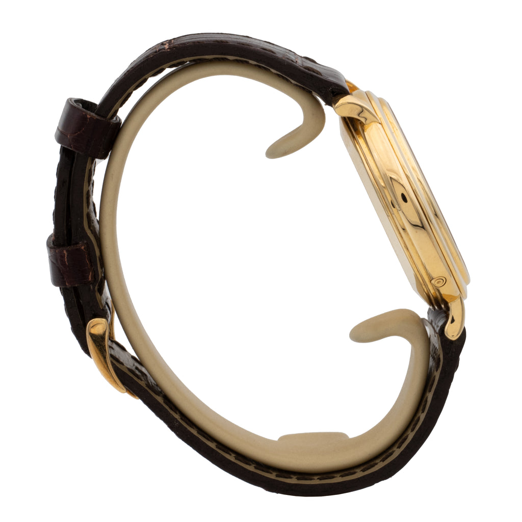 Boîtier en or jaune, sur bracelet cuir et boucle ardillon en or jaune signée.